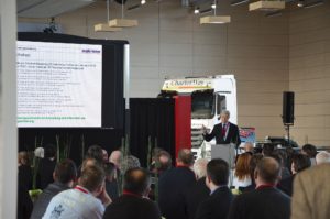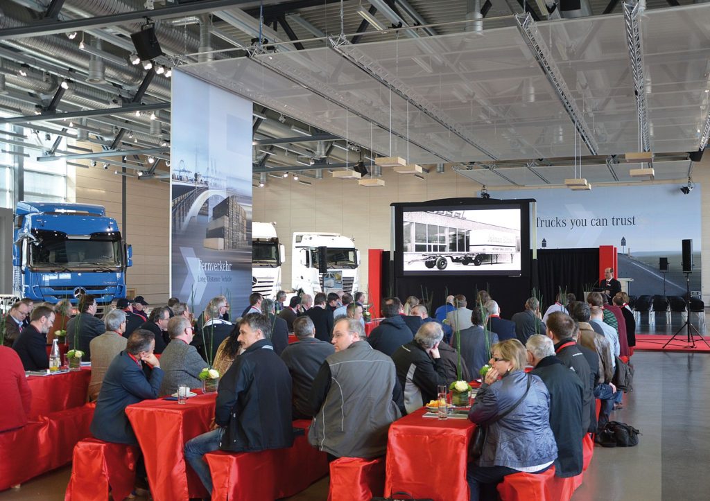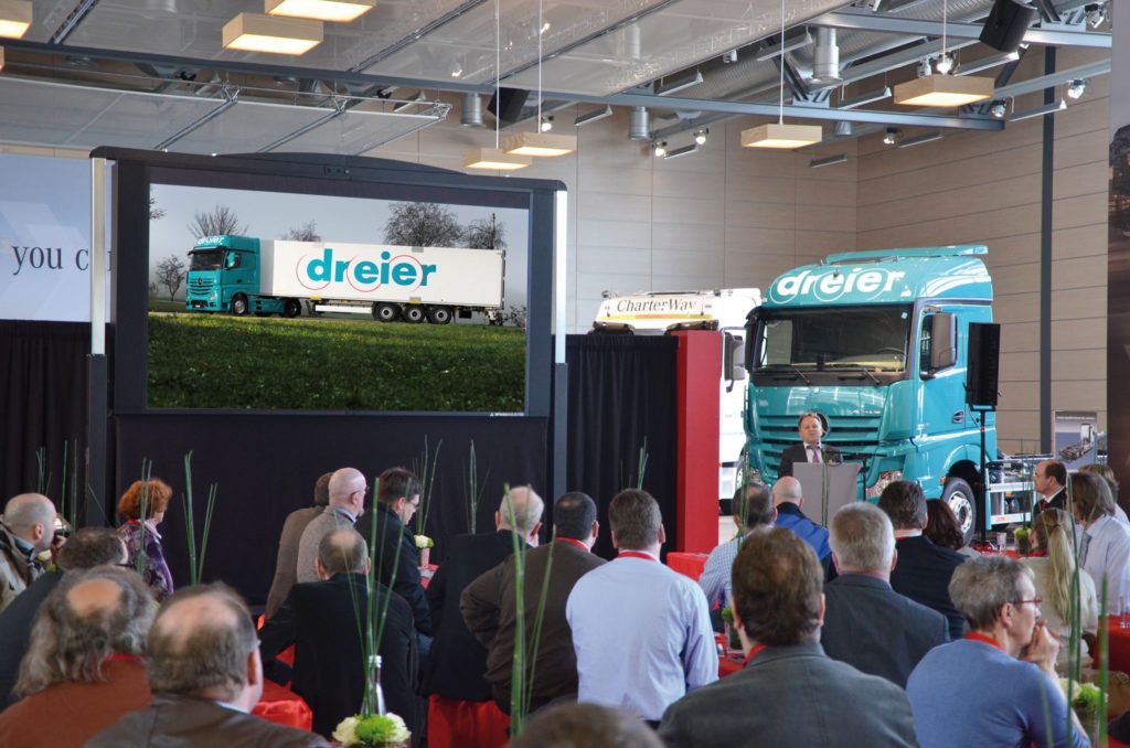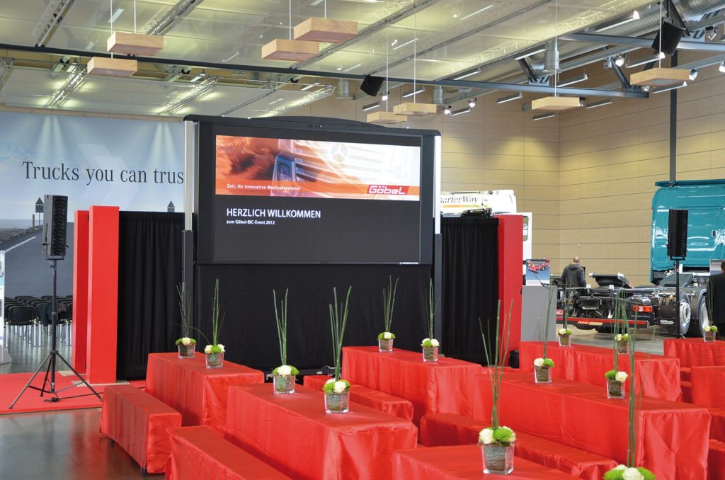 Für die Vorträge wurde ein eigens für diese Veranstaltung bereitgestellter LED-Großbildschirm der Fa. hifi-klang zur Verfügung gestellt. Komplettiert wurden die verschiedenen Vorträge auch von den dafür speziell eingeladenen Partnerfirmen wie z.B. der UTA, der Daimler Fleetboard GmbH, dem TÜV, Lewa und einer Mercedes-Benz ACTROS-Präsentation. Neben den Fachvorträgen dieser Firmen konnten sich die Besucher, auch persönlich und in aller Ruhe, am eigens aufgebauten Informationsstand ausführlich beraten lassen.